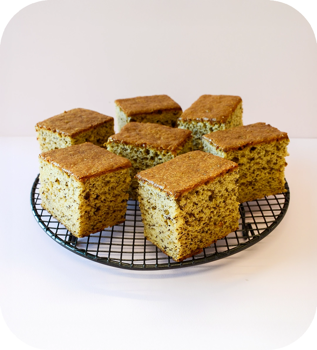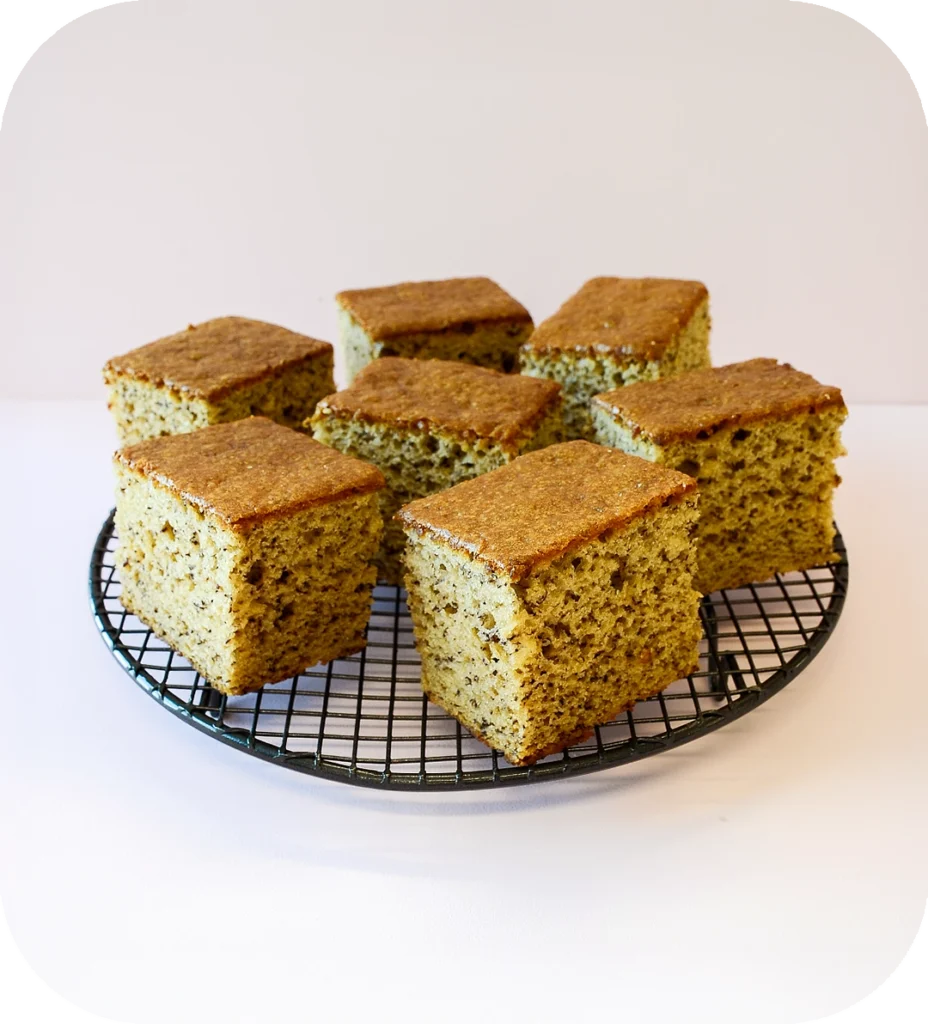 Typical, sweet banana cake with visible dark banana seed against a golden to mid-yellow-brown crumb.