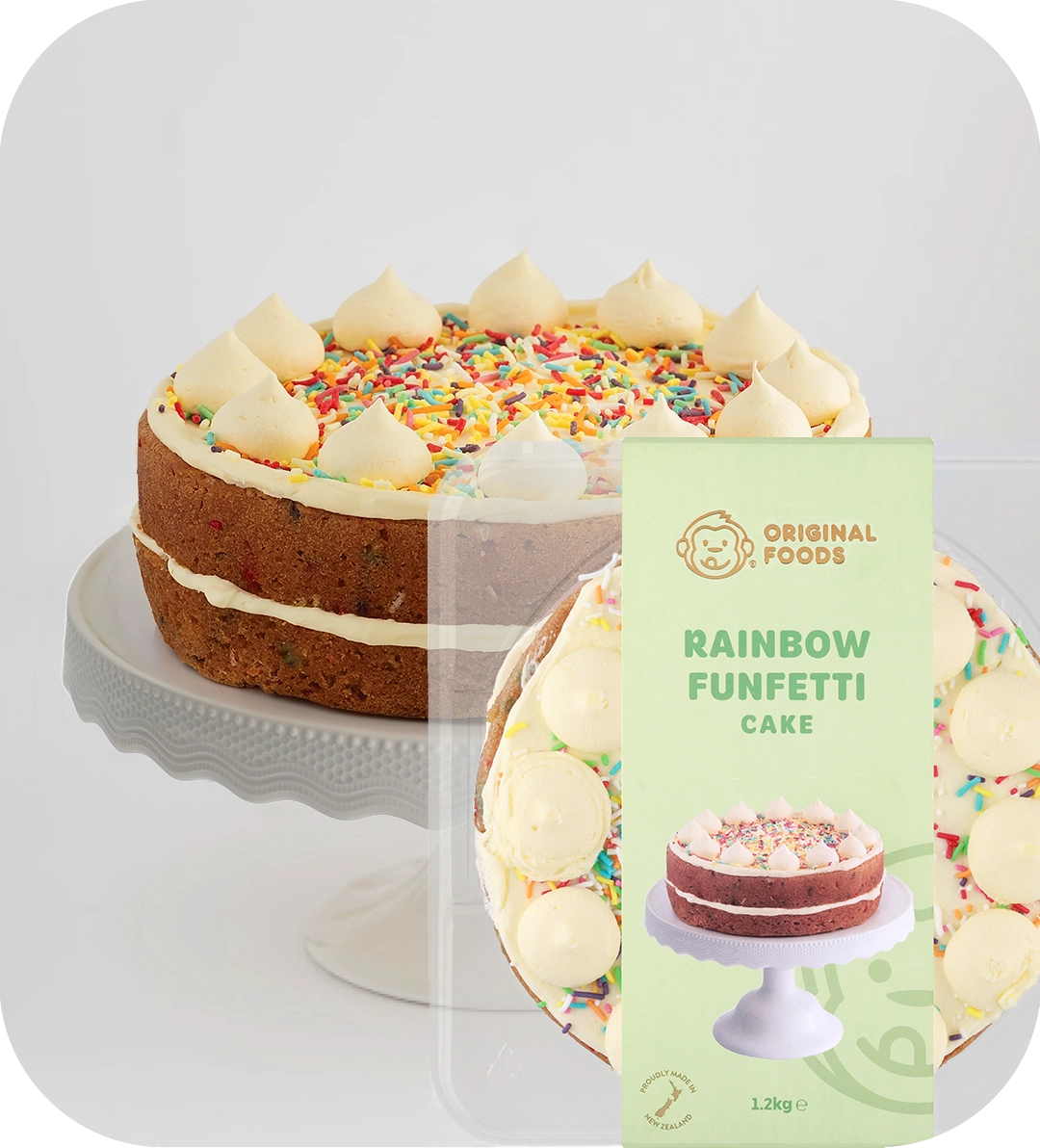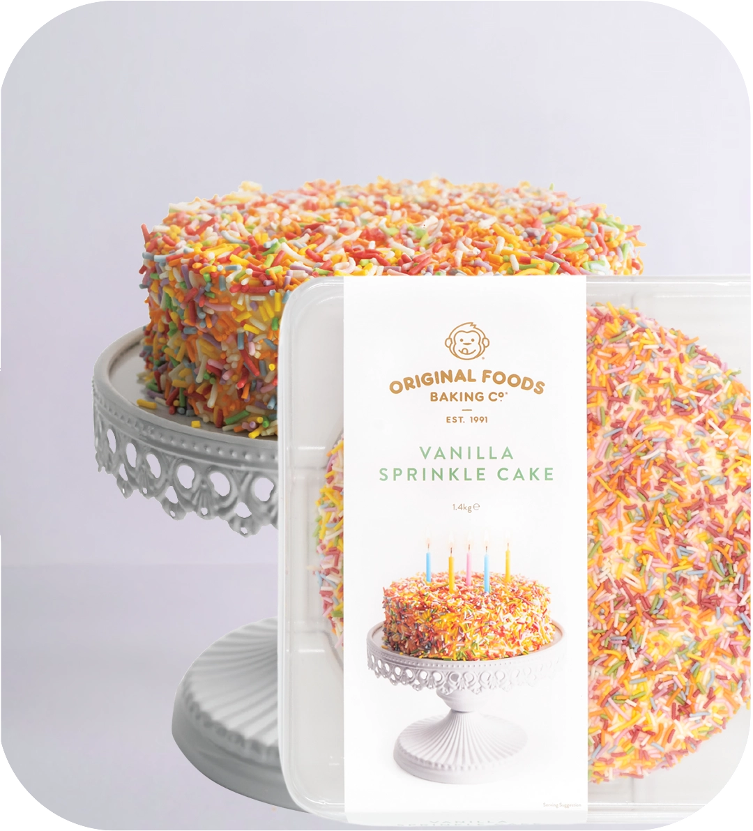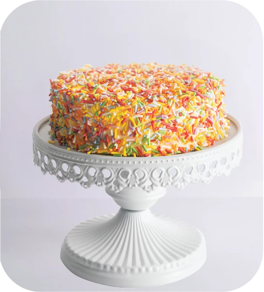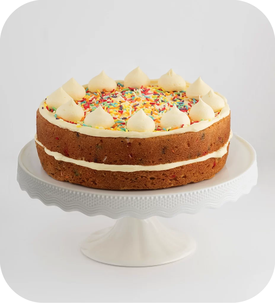 Is it even a party without sprinkles? The fun has already started with this delicious moist vanilla cake, covered in clouds of vanilla frosting and topped with rainbow sprinkles. Perfect for any occasion.