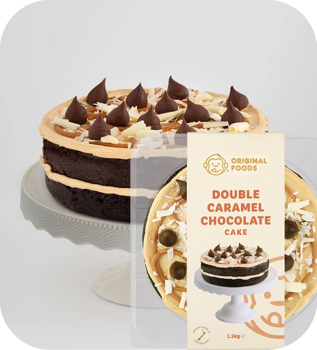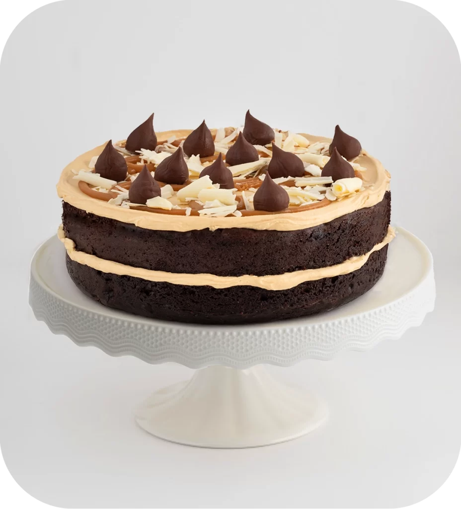 Every bite is pure choc-caramel bliss! Decadent chocolate cake layered with caramel cream cheese icing, finished with more luscious icing, a caramel drizzle, and a sprinkle of white choc flakes and dark choc drops.