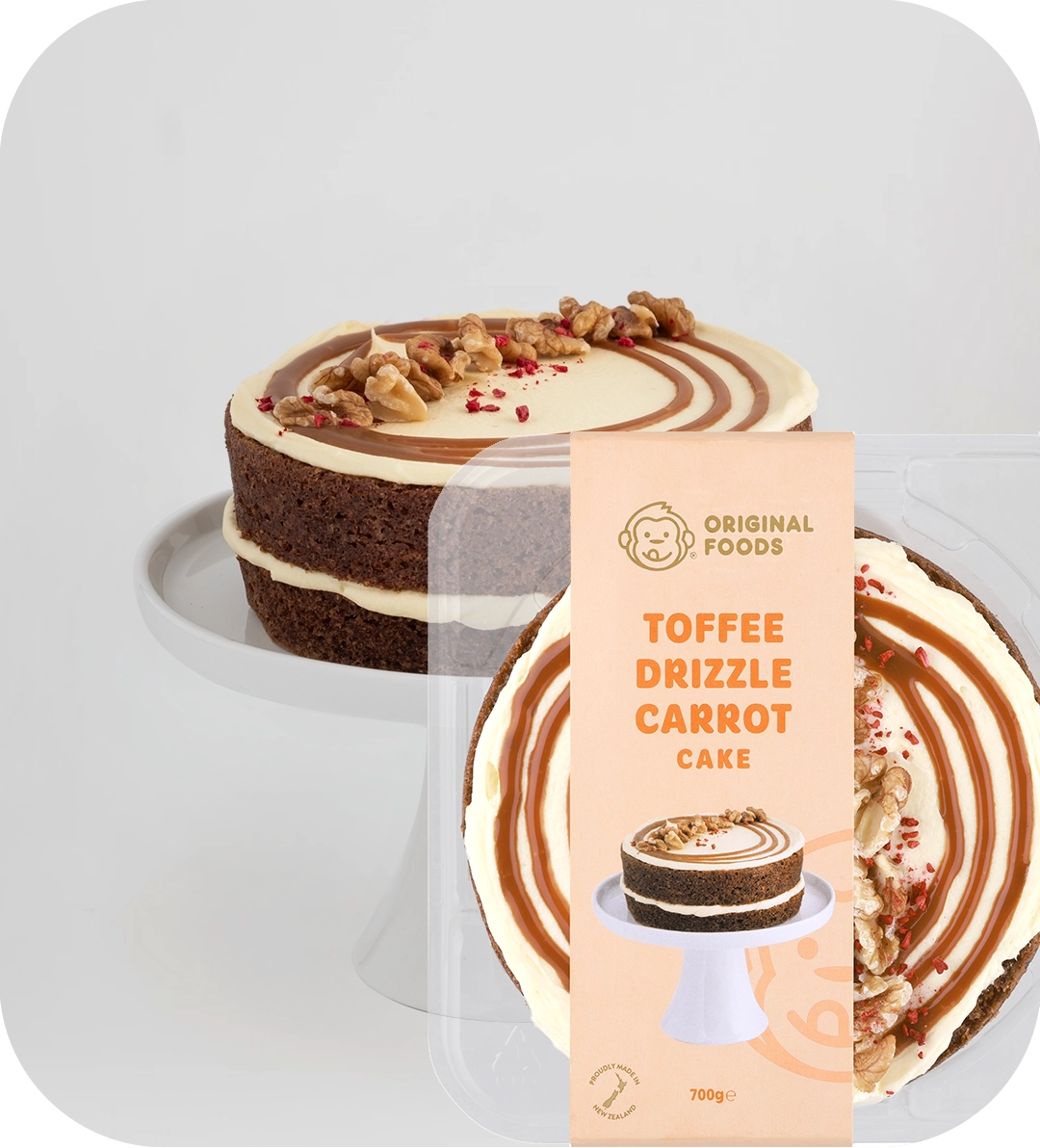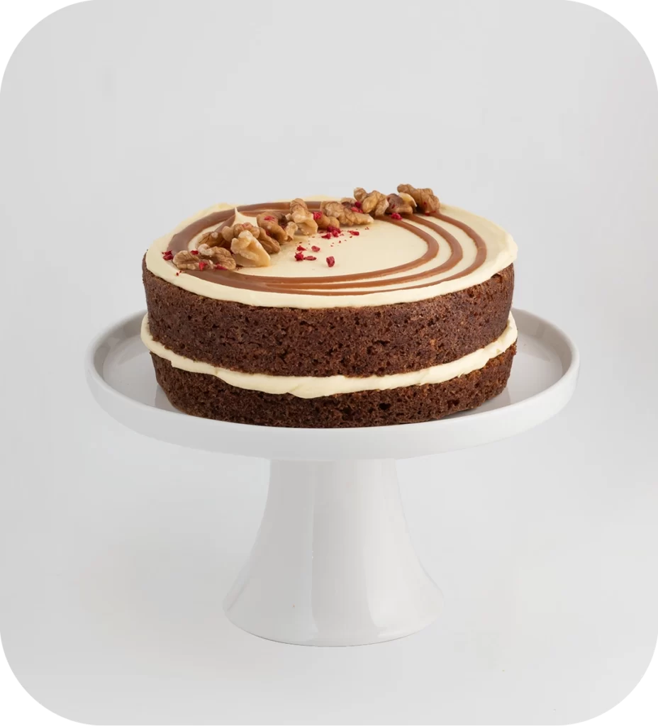 A perfect balance of rich, nutty deliciousness in every bite! Moist carrot cake layered with cream cheese icing, topped with toffee drizzle, walnuts, and freeze-dried raspberries.
