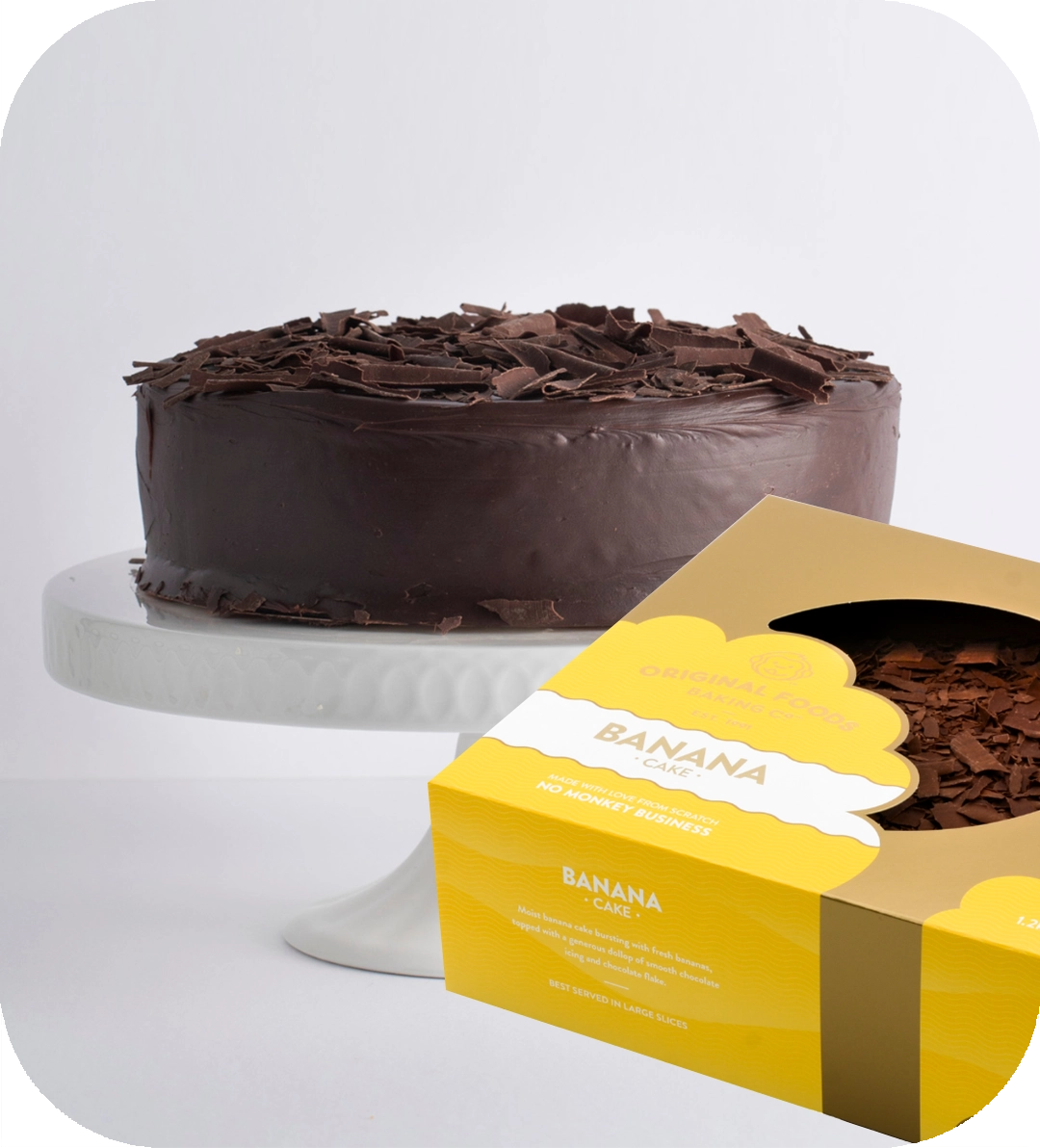 A moist, light cake made with fresh bananas and topped with choc ganache.