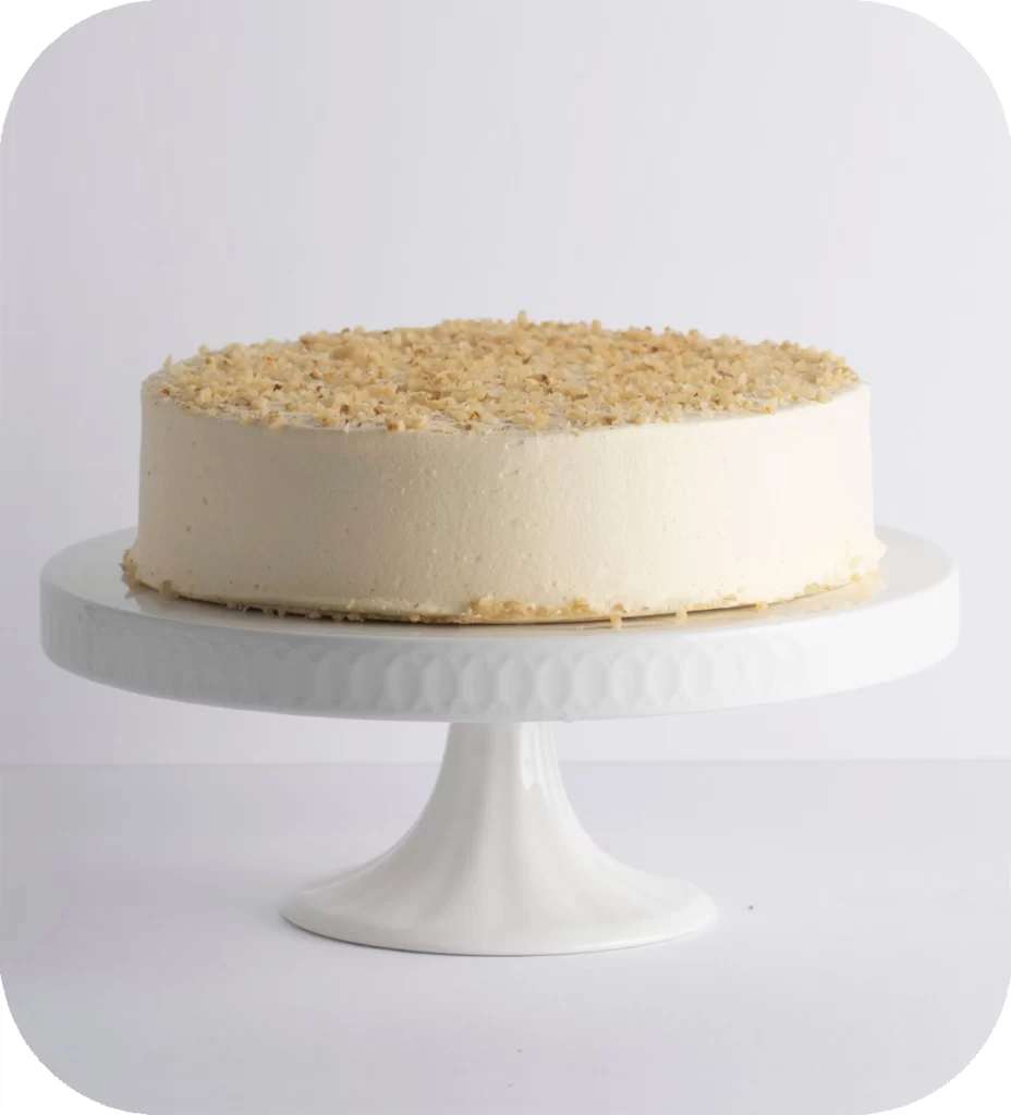 A perfect balance of rich, nutty deliciousness in every bite! Moist carrot cake layered with cream cheese icing, topped with toffee drizzle, walnuts, and freeze-dried raspberries.