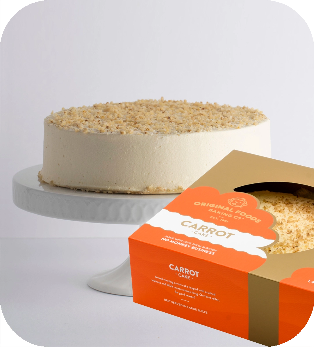 Our best seller! Award-winning, moist carrot cake topped with crushed walnuts and cream cheese icing.