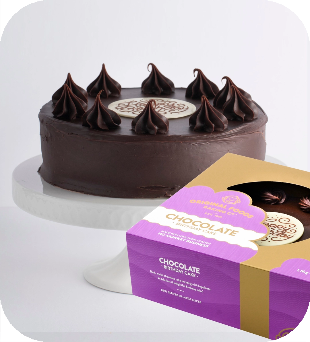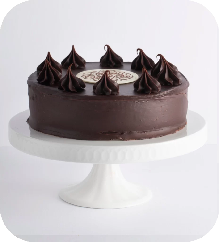 A special day needs a special cake. Rich chocolate cake iced with chocolate ganache, decorated with rosettes and a Happy Birthday message.