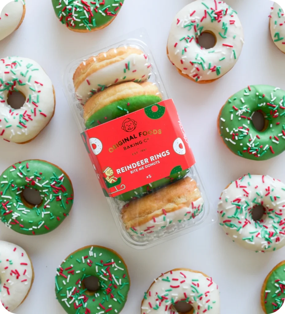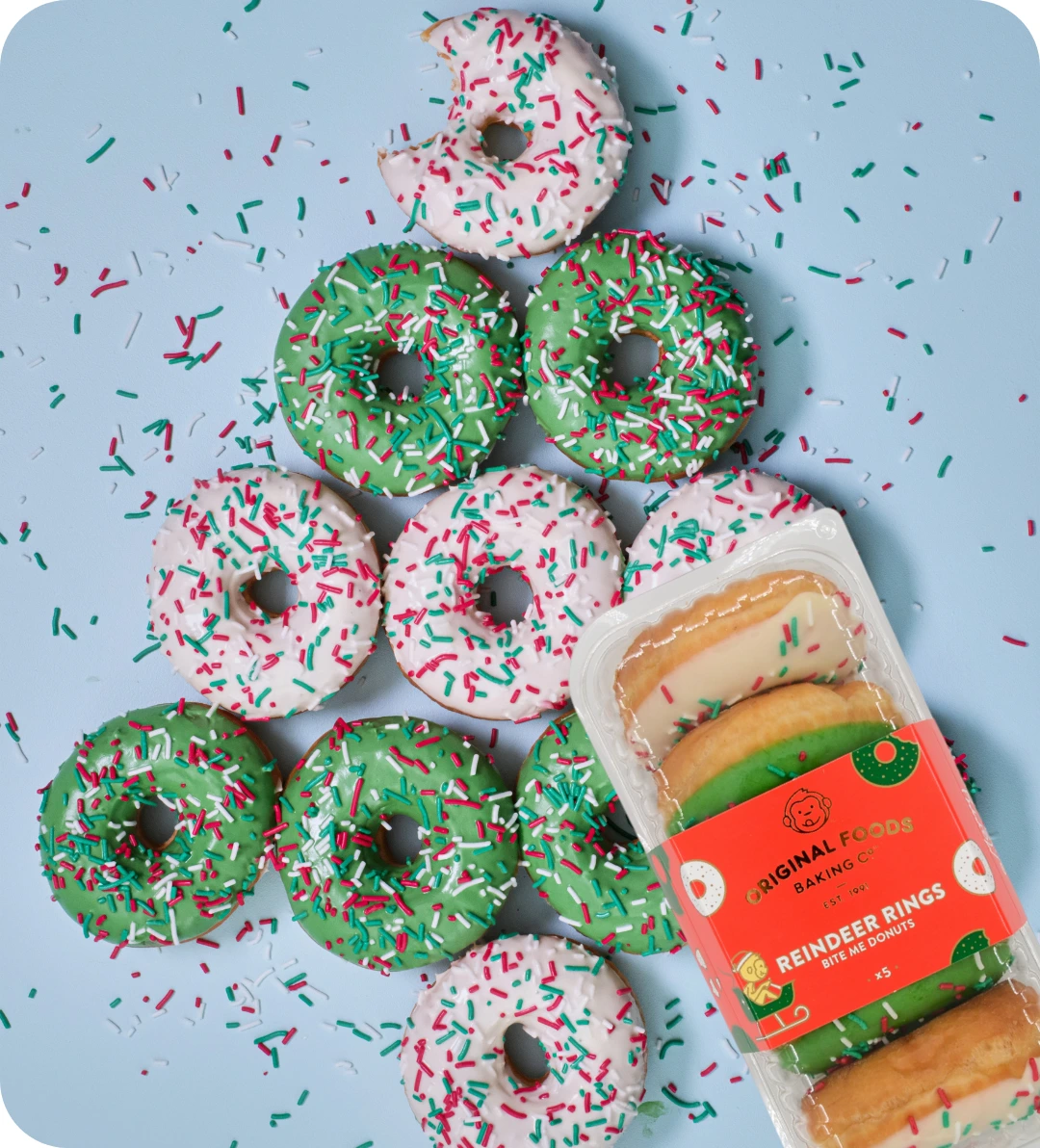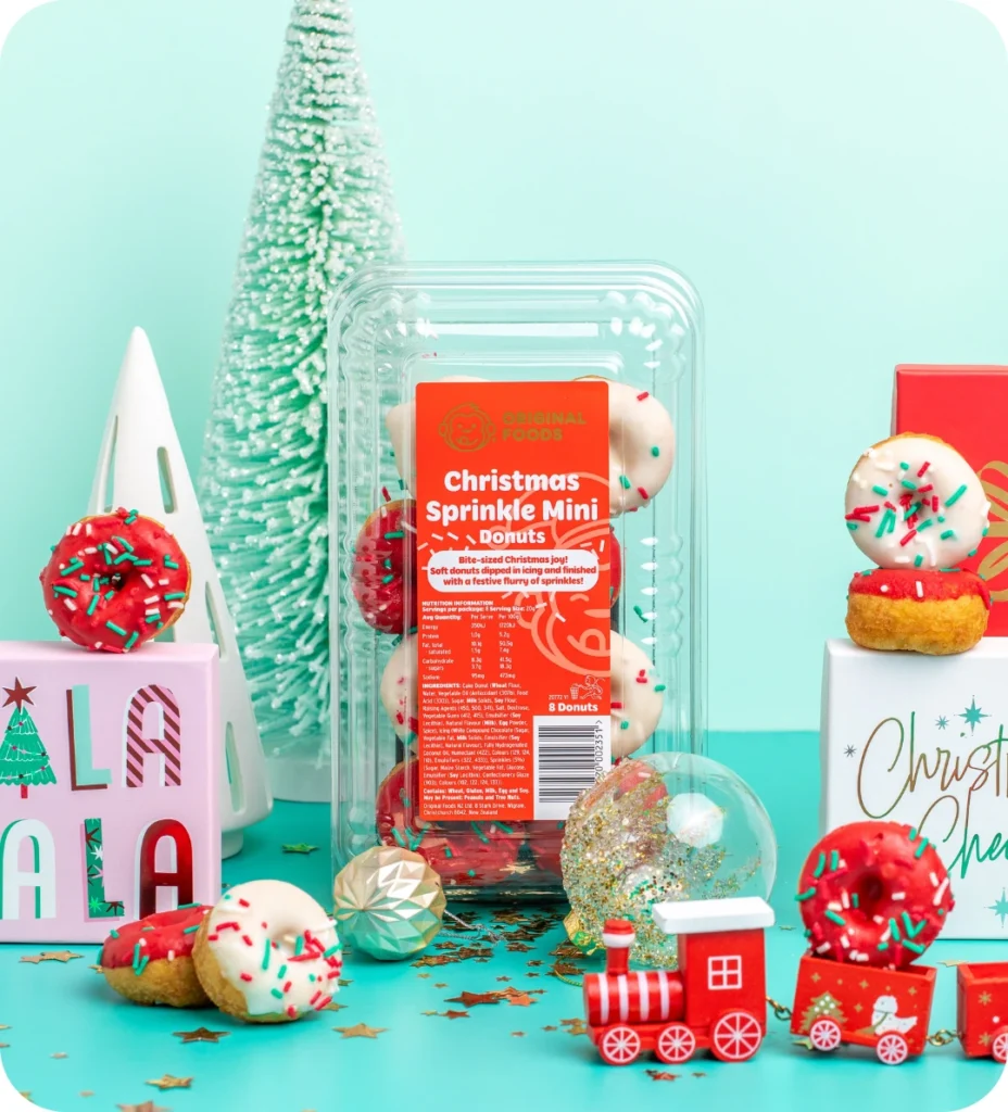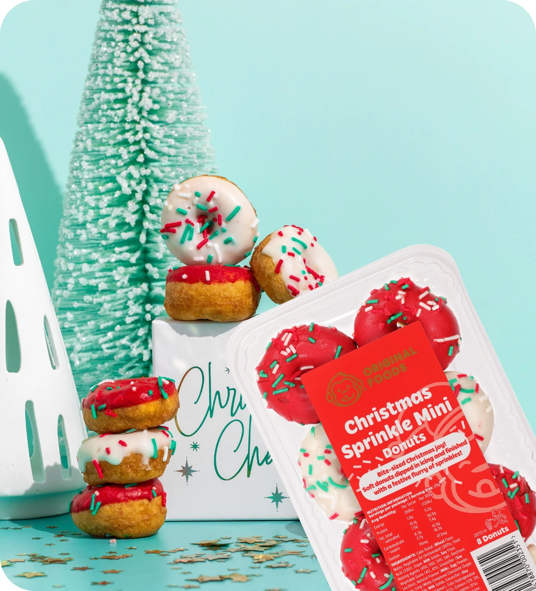 Bite-sized Christmas joy! Soft donuts dipped in icing and finished with a festive flurry of sprinkles!
