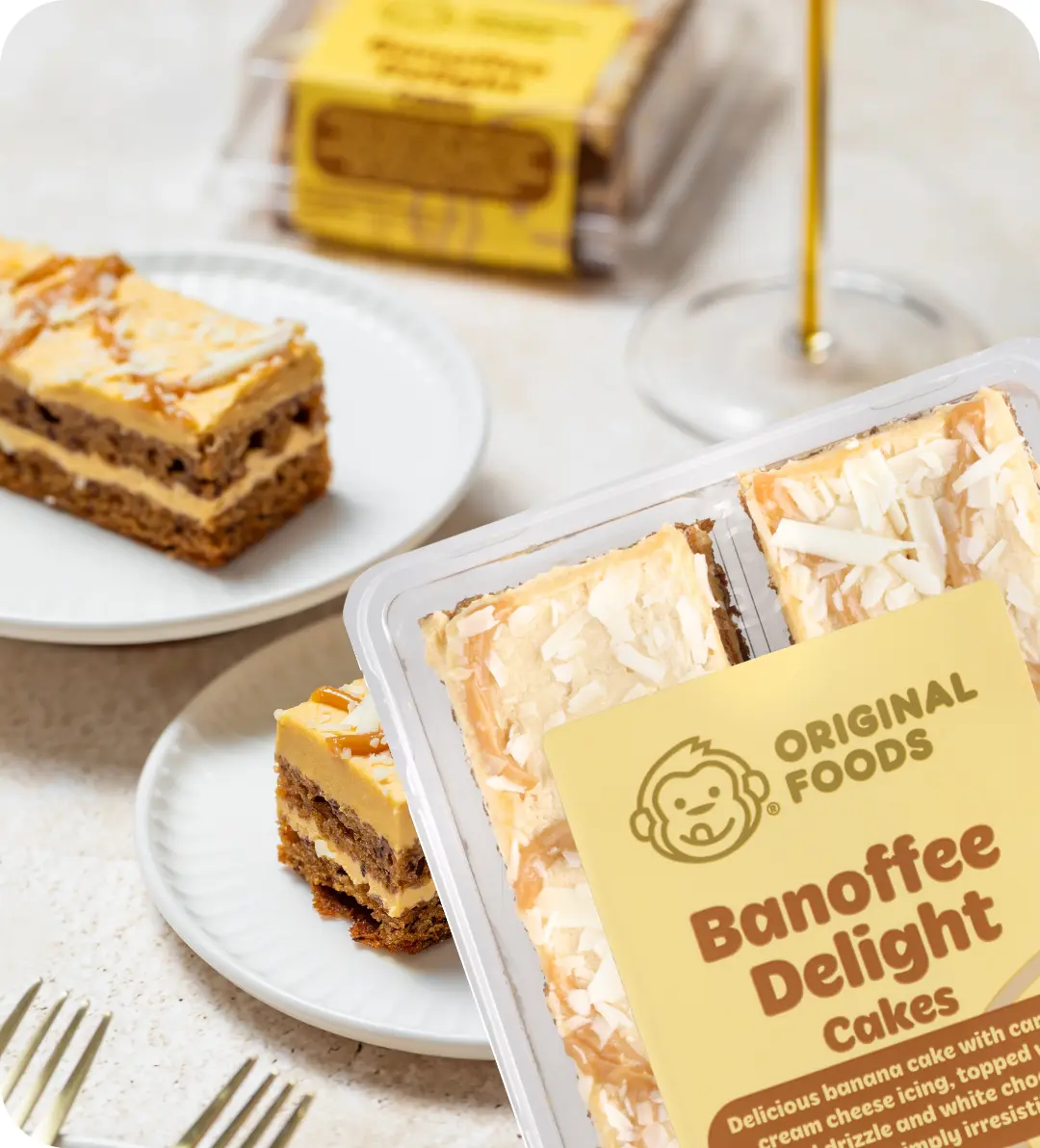Golden banana cake topped with rich, chocolate ganache, salted caramel drizzle and dark choc flakes.