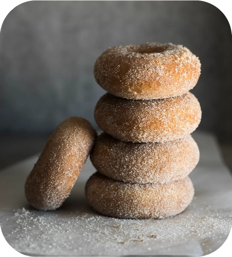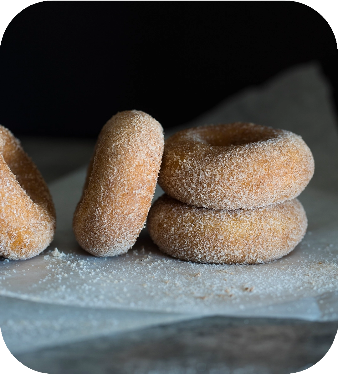 Classic, medium sized, cinnamon dusted cake donuts. 48 reasons to put a smile on your dial and some yummy in your tummy.
