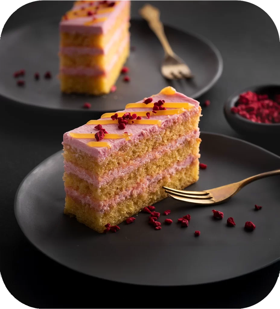 A burst of citrus and berry bliss in every bite! Irresistibly moist lemon cake layered with pink cream cheese icing, finished with a swirl of lemon curd and a sprinkle of freeze-dried raspberries.
