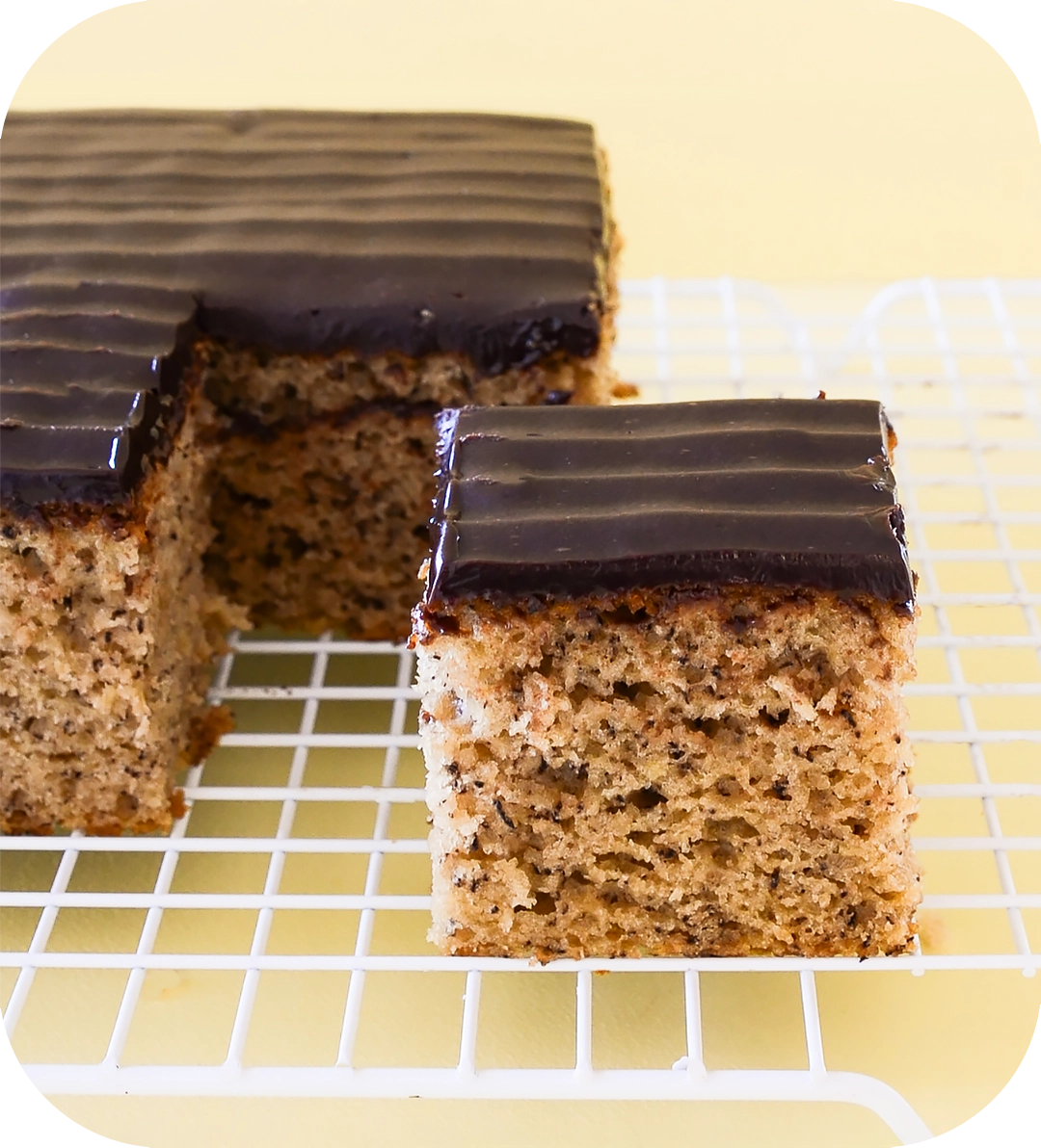 A taste and textural sensation. Moist, light cake made with fresh bananas and topped with chocolate ganache.