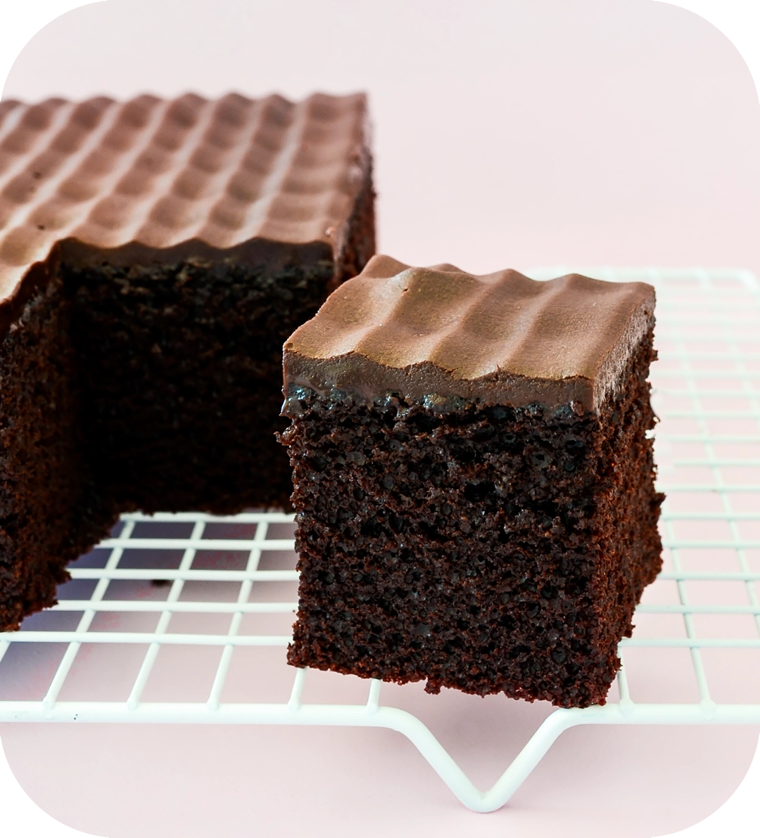 Chocolate on chocolate. Rich chocolate cake coated in thick chocolate ganache. Delicious decadence in every mouthful.