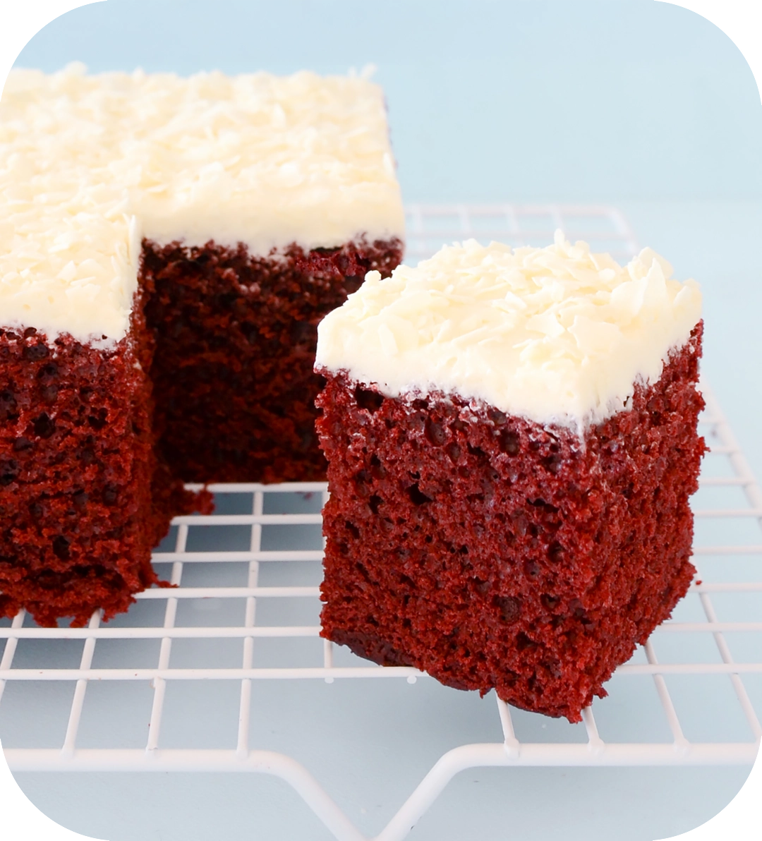 What secrets does this dark red cake hold? Chocolate with a difference, topped with vanilla frosting and coated in creamy white choc flakes.