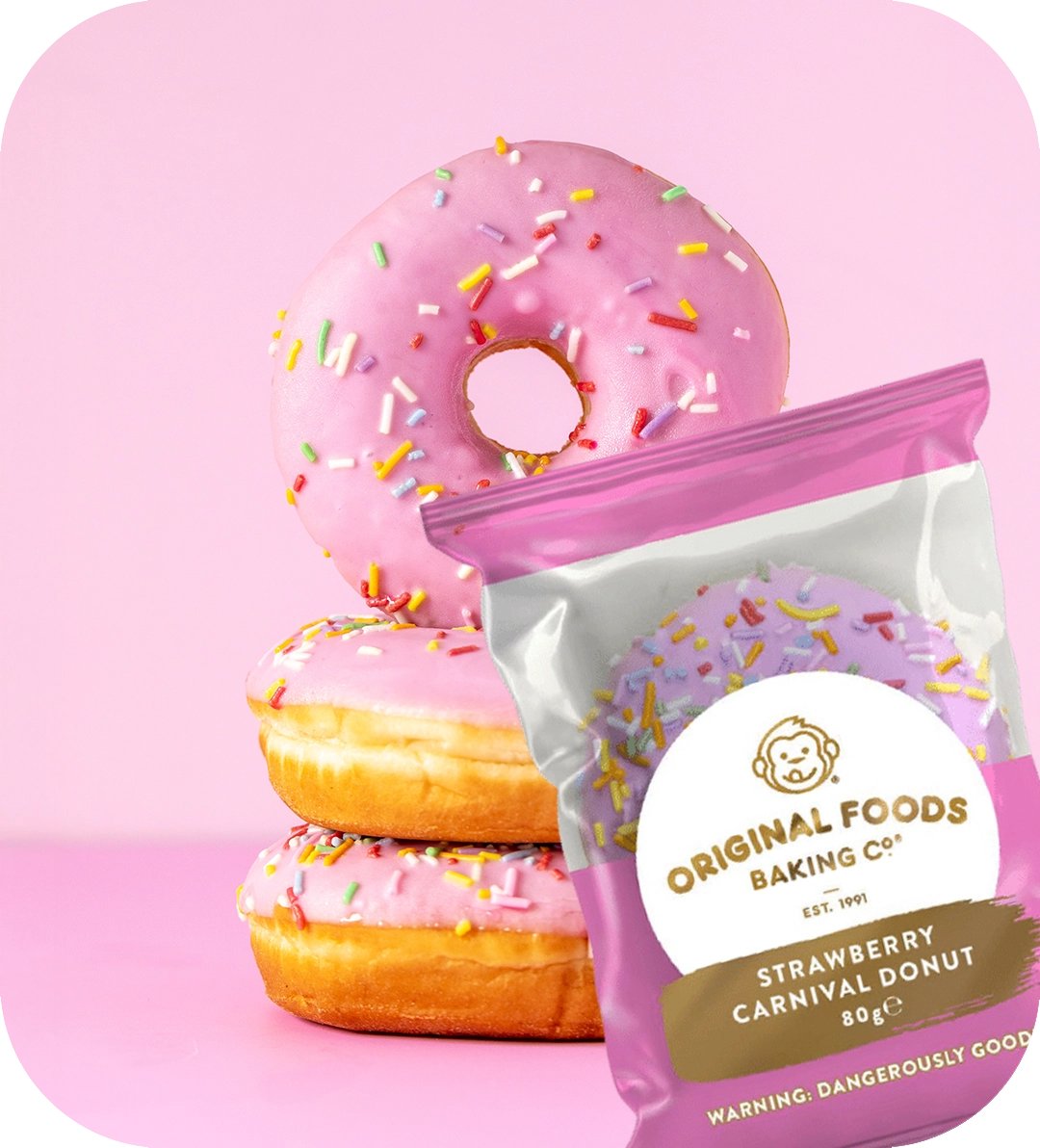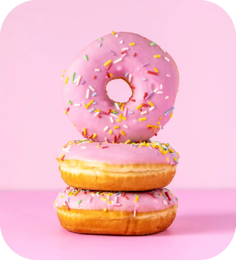 Individually wrapped, soft, yeast-raised large ring donuts hand-dipped and decorated with multi-coloured sprinkles.
